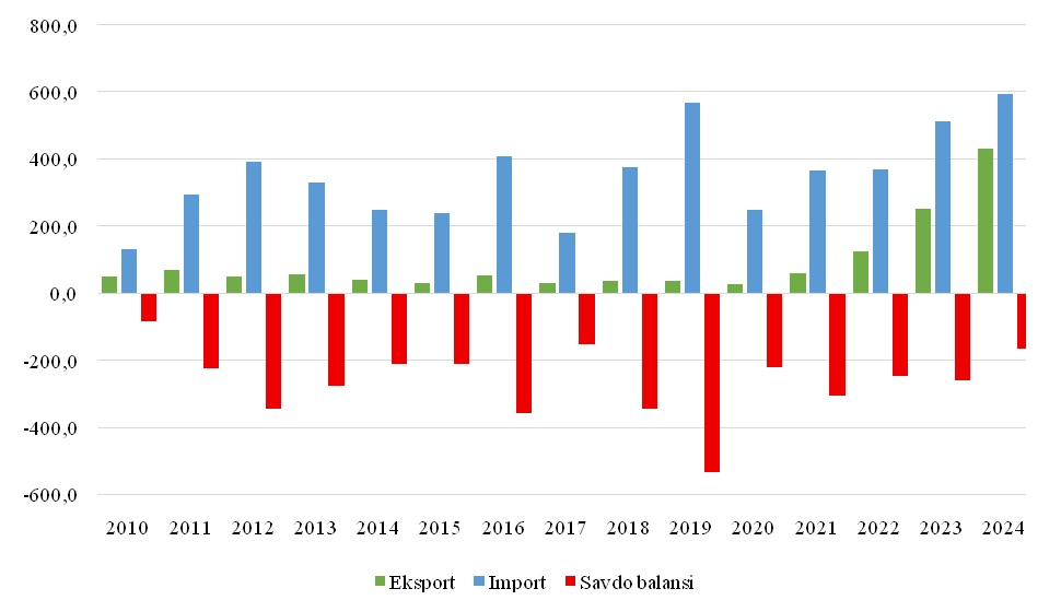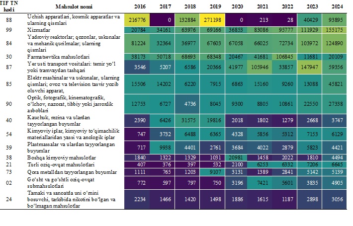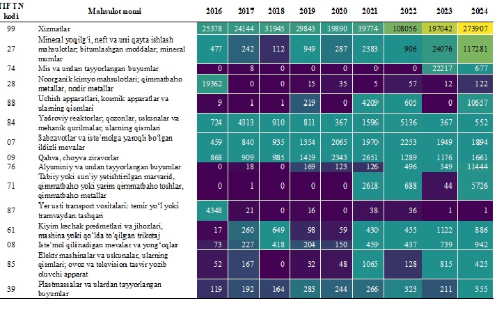— alyumin va undan tayyorlangan buyumlar (TIF TN 76) eksporti 2020-yilda deyarli eksport qilinmagan bo‘lsa, 2024-yilda eksport hajmi 11.4 million AQSH dollariga yetdi;