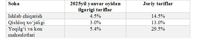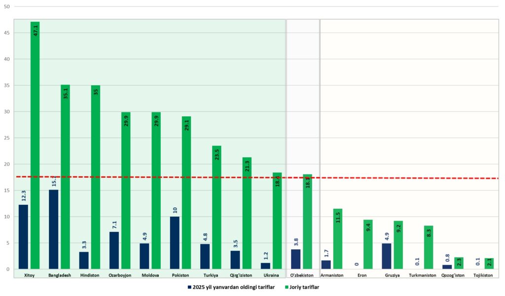 Ushbu sharoitda O‘zbekiston bazaviy toifadagi davlat sifatida AQSHning o‘rtacha tarif stavkasining keskin oshishiga duch keldi.Bunda, AQSHning O‘zbekistondan importi uchun o‘rtacha tarif stavkasi2024-yildagi 3,8 foizdan 2025-yilda 18,1 foizga ko‘tarildi. Ayniqsa, yoqilg‘i va kon mahsulotlari (29,5 foiz) hamda ishlab chiqarish sektori (14,5foiz) bo‘yicha tariflarning sezilarli oshishi o‘zbekistonlik eksportyorlar uchun bozorga kirishni qiyinlashtirib, past marjali mahsulotlar eksporti raqobatbardoshligini pasaytirishi mumkin.