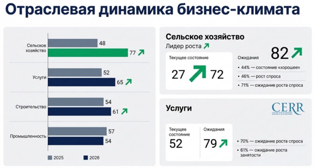 В сельском хозяйстве значение бизнес-климата выросло на 62% относительно аналогичного периода прошлого года и составило77 пунктов, против 48-ми пунктов в январе 2025 года.