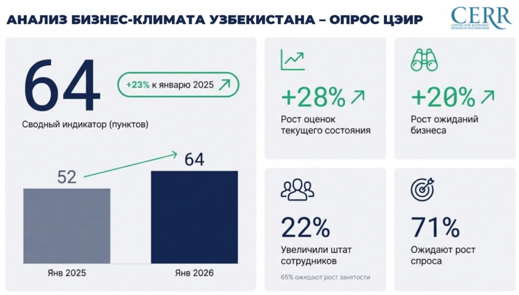 В январе текущего года сводный Индекс бизнес-климата Узбекистана составил 64 пункта(по шкале от −100 до +100), что на 23%выше уровня 2025 года.