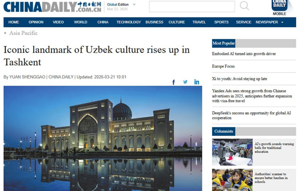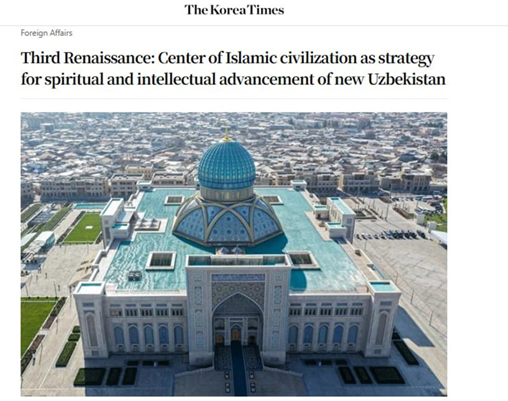 China Daily называет Центр исламской цивилизации «одним из ключевых культурно-научных проектов Узбекистана», способствующим укреплению культурного и гуманитарного сотрудничества между Узбекистаном и Китаем, а The Korea Times отмечает, что комплекс «отражает гуманистическую и просветительскую сущность исламской цивилизации» и «служит современной площадкой для культурного диалога и научного сотрудничества».